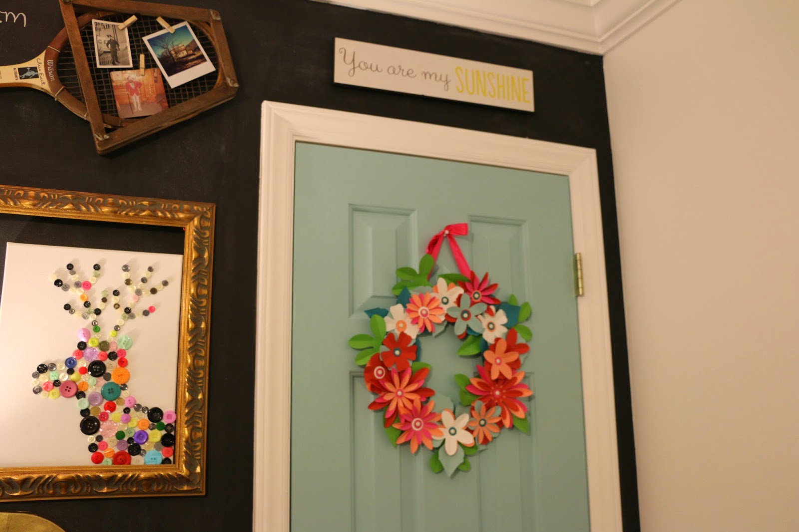 I think buttons are a really cute way to add a pop of color to my black chalkboard wall. Here's how you can make your own DIY Button Deer CanvasMy dad used to play tennis back in "the day" when they had wooden racquets with presses. I am not very good at tennis, but it's so sweet to have something with so many memories passed down to me especially since my dad got it when he was in highschool and I am in highschool. I also added some mini clothespins with some old pictures of my grandfather in WWII, my daddy playing dress up, and the old mill in the town where my mom grew up. I also love adding cute chalk messages on my wall. The white owl is one of my favorite finds from West Elm.